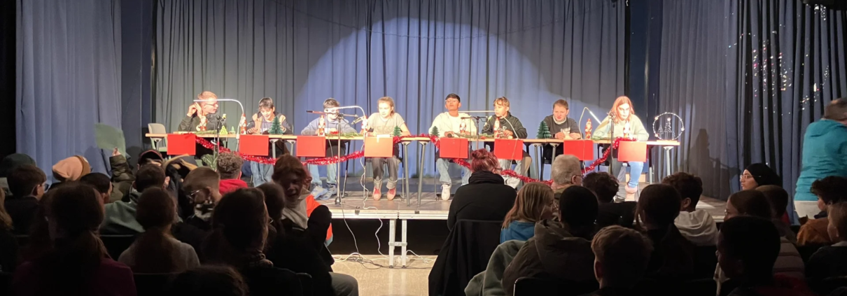 Die Bläserklasse 7e unter der Leitung von Herrn Grimm eröffnete die Veranstaltung und stimmte das Publikum mit weihnachtlichen Melodien auf den Vorlesewettbewerb ein. Die warmen Klänge erfüllten die Aula mit festlicher Ruhe, bevor die Spannung allmählich wieder anstieg. Eine besondere Mischung aus Freude, Nervosität und gemeinschaftlicher Aufmerksamkeit lag in der Luft: konzentrierte Gesichter bei den Lesenden, leuchtende Augen im Publikum, erwartungsvolle Lehrkräfte und aufmerksame Jury-Mitglieder, die gemeinsam diesen besonderen Moment erlebten.